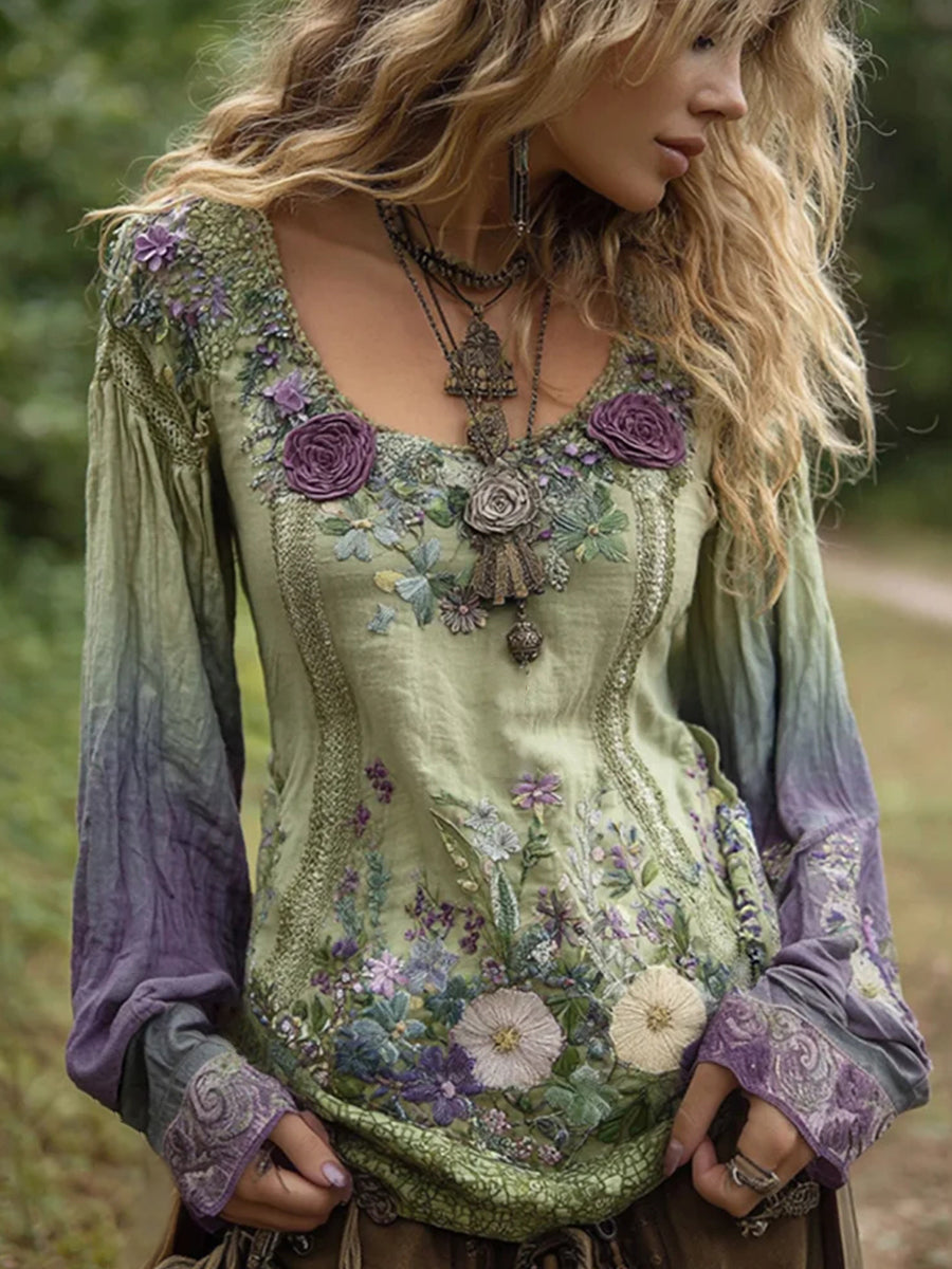 Women's Vintage Elegant Floral Embroidered Linen Shirt